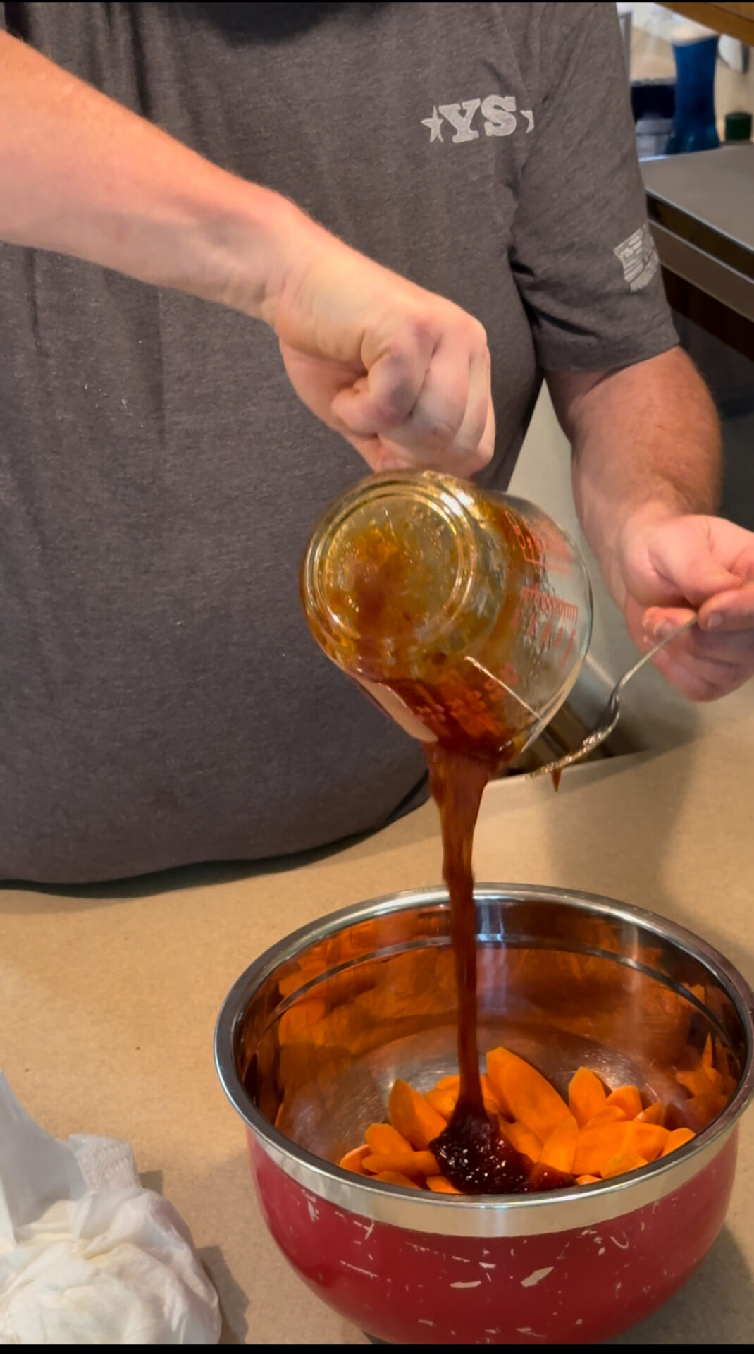 Once your bacon is cooked, don’t throw away that grease! We’re gonna mix it up with some hot honey, sweet heat seasoning, and a splash of olive oil. This glaze is where the magic happens – it’s gonna add the perfect kick to those carrots.