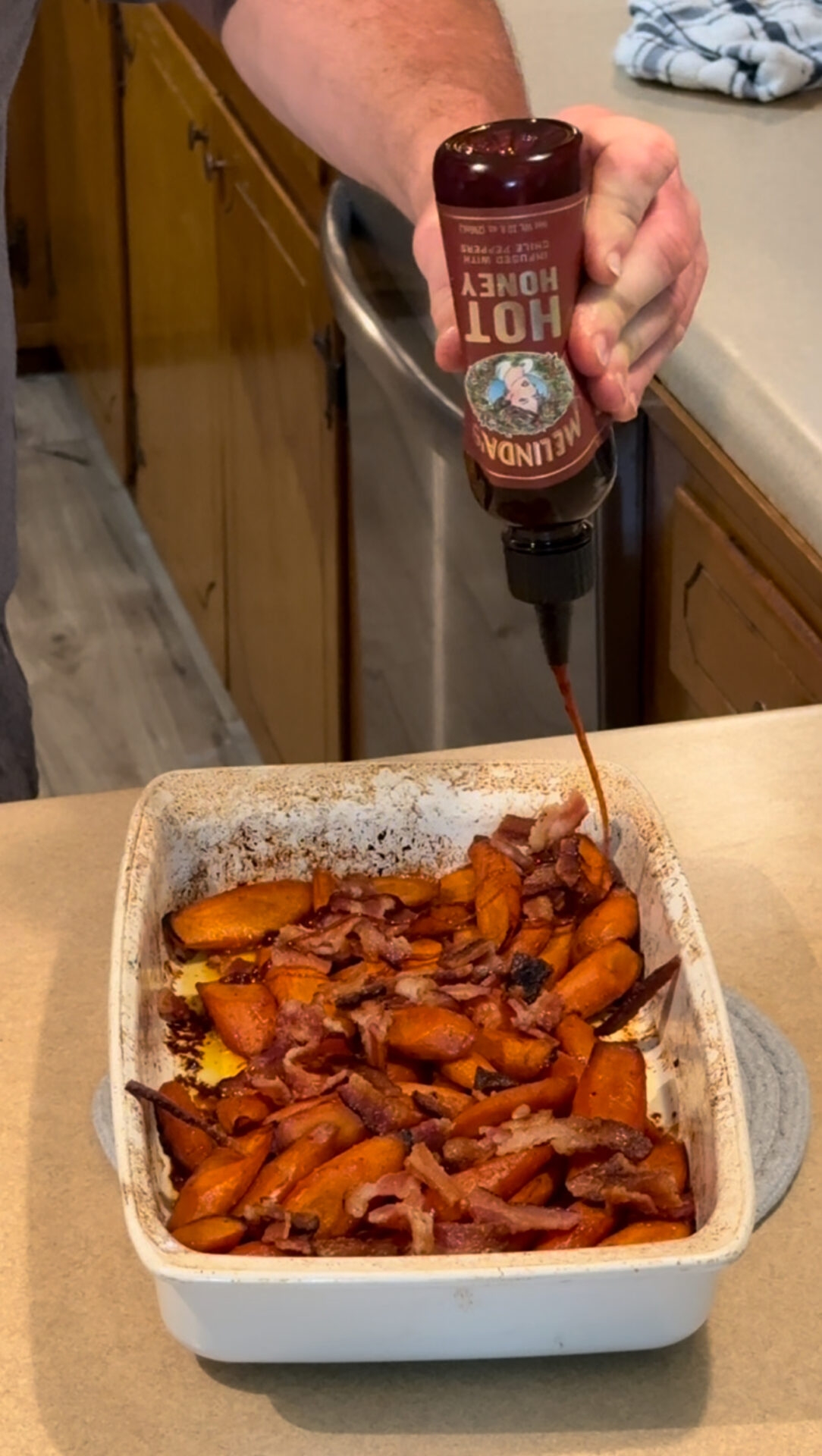 - Cook bacon to desired doneness . Wash & peel carrots . Cut carrots into about 2 inch pieces . Once bacon is cooked mix bacon grease , hot honey, sweet heat seasoning & olive oil . Mix carrots and glaze in a bowl . Place in sprayed baking dish . Bake at 375 degrees they will take 40-50 minutes . Stir every 10-15 minutes . Once done add bacon and more hot honey . Then enjoy !