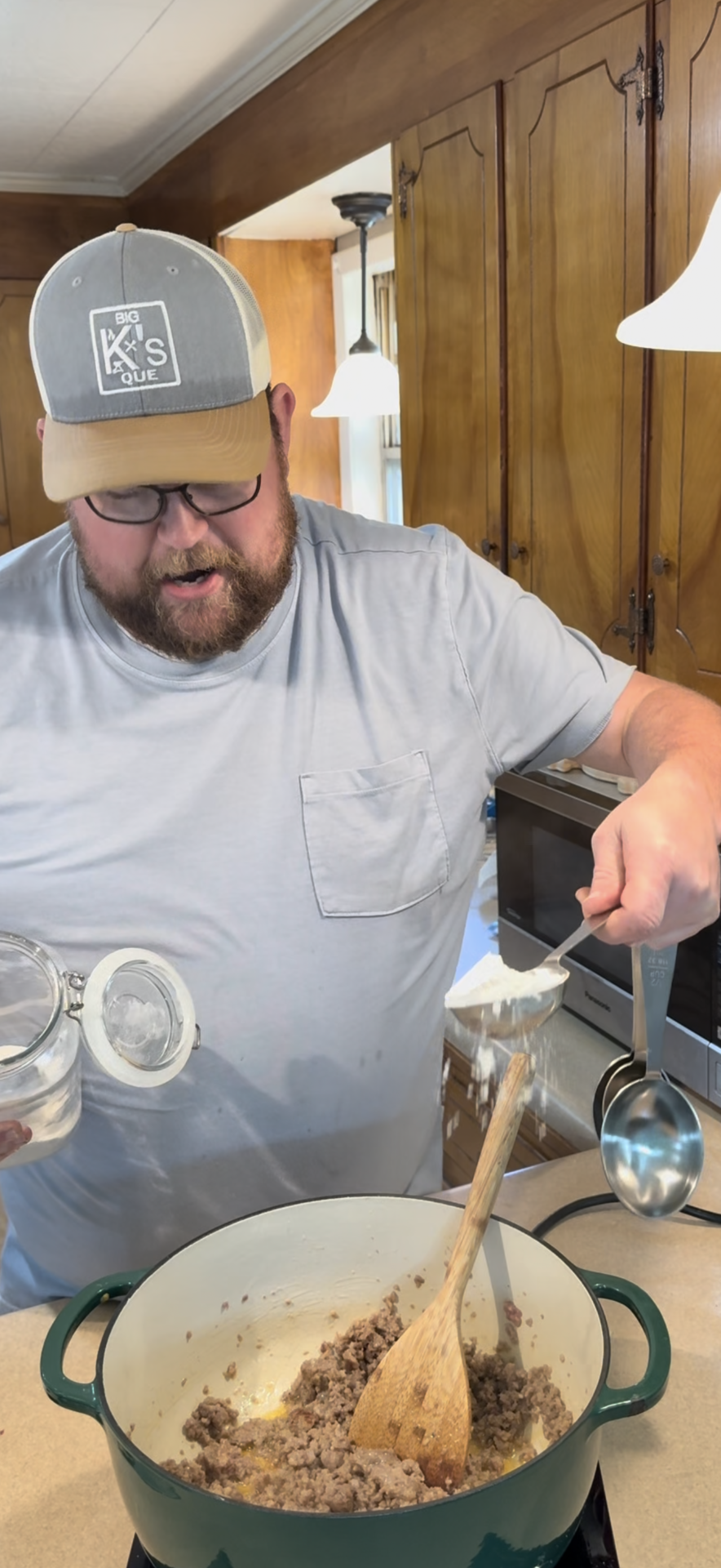 This is when the magic happens – the smell will be incredible! Once the sausage is browned, sprinkle in your flour, stirring it in and letting it cook for a minute or two.