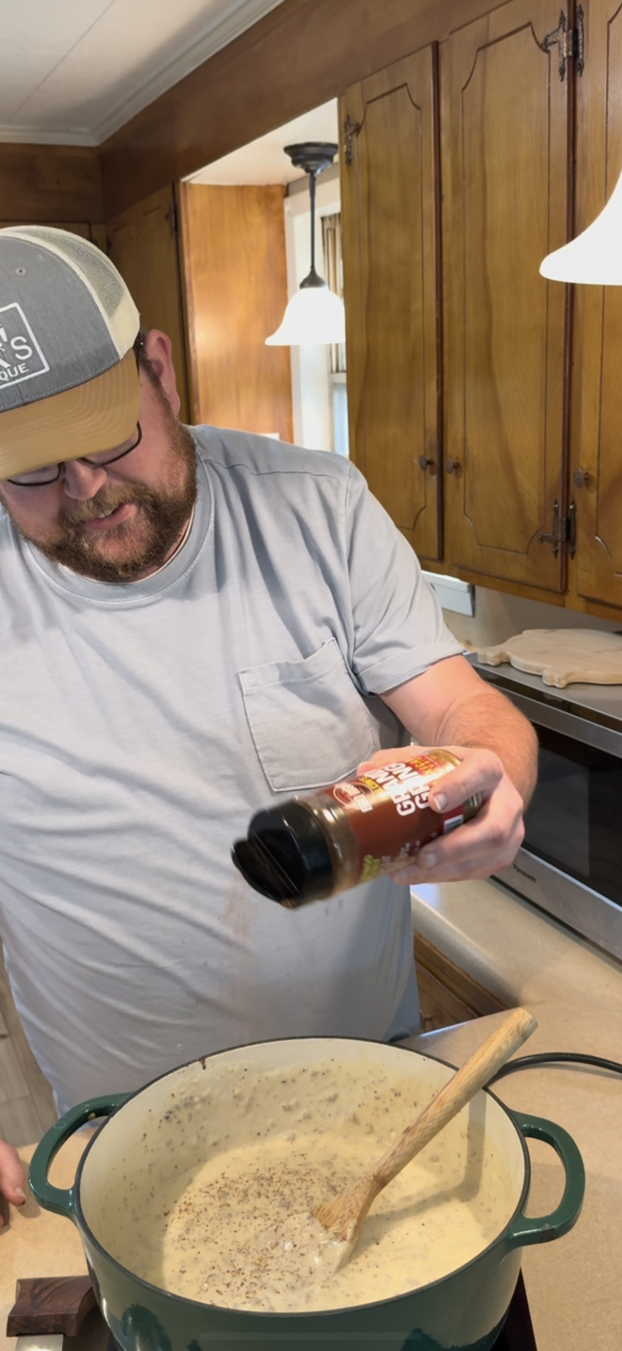 Then, slowly pour in those four cups of milk, adding a bit at a time while stirring. Season with salt, pepper, and your Mexican seasoning to taste. Once it thickens up, it’s time to add in the cheese and Rotel.