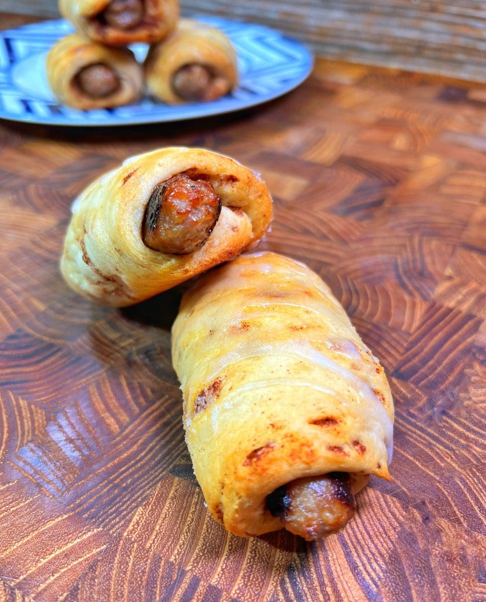 Close-up of two sausage rolls wrapped in golden-brown pastry on a wooden surface. A blue patterned plate with more sausage rolls is blurred in the background. The rolls have a crispy, flaky texture.