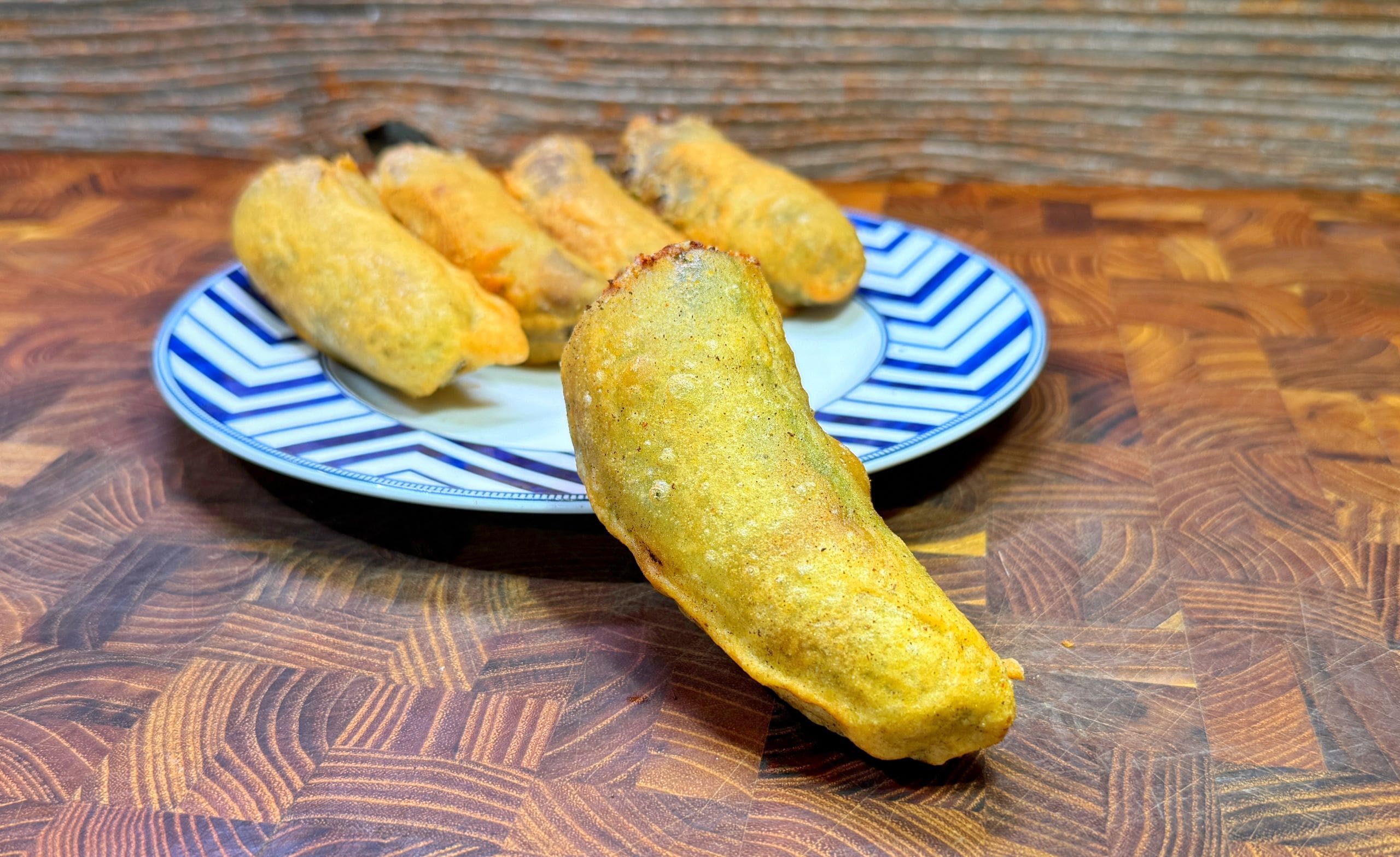 - Batter the stuffed jalapeños, and place them in the hot oil for 5-7 minutes, until golden brown. Remove and place on paper towel lined plate to absorb excess oil. Allow to rest for 10-15 minutes before serving to avoid a burnt mouth.