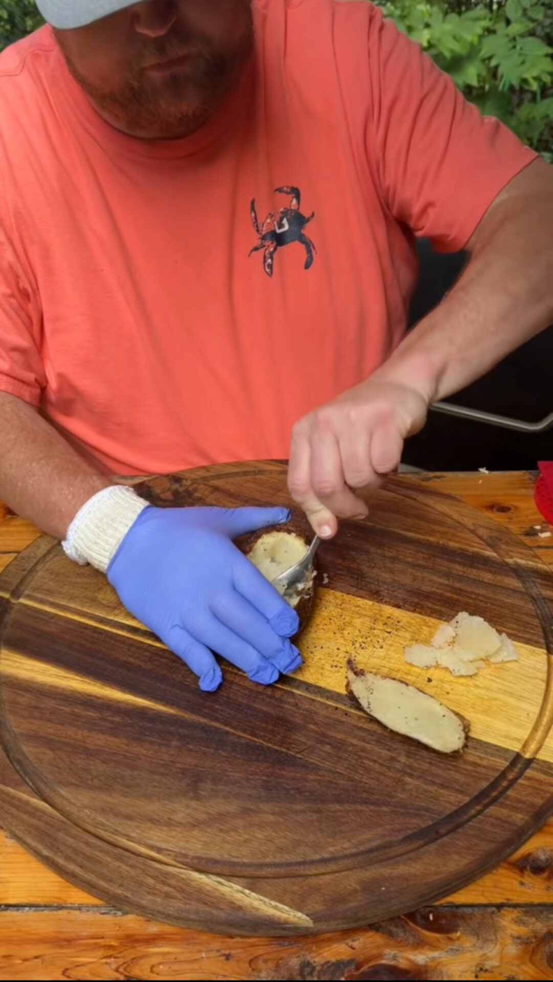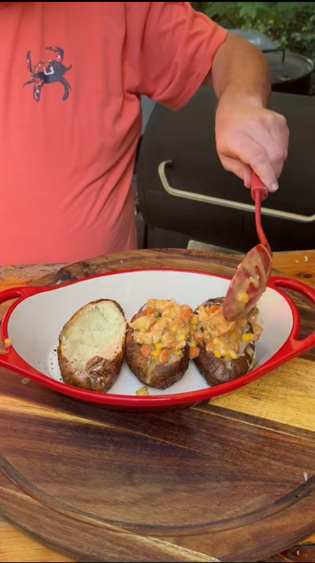 A person wearing a coral shirt and blue gloves holds a red and white baking dish filled with baked stuffed potatoes topped with melted cheese and various vegetables.