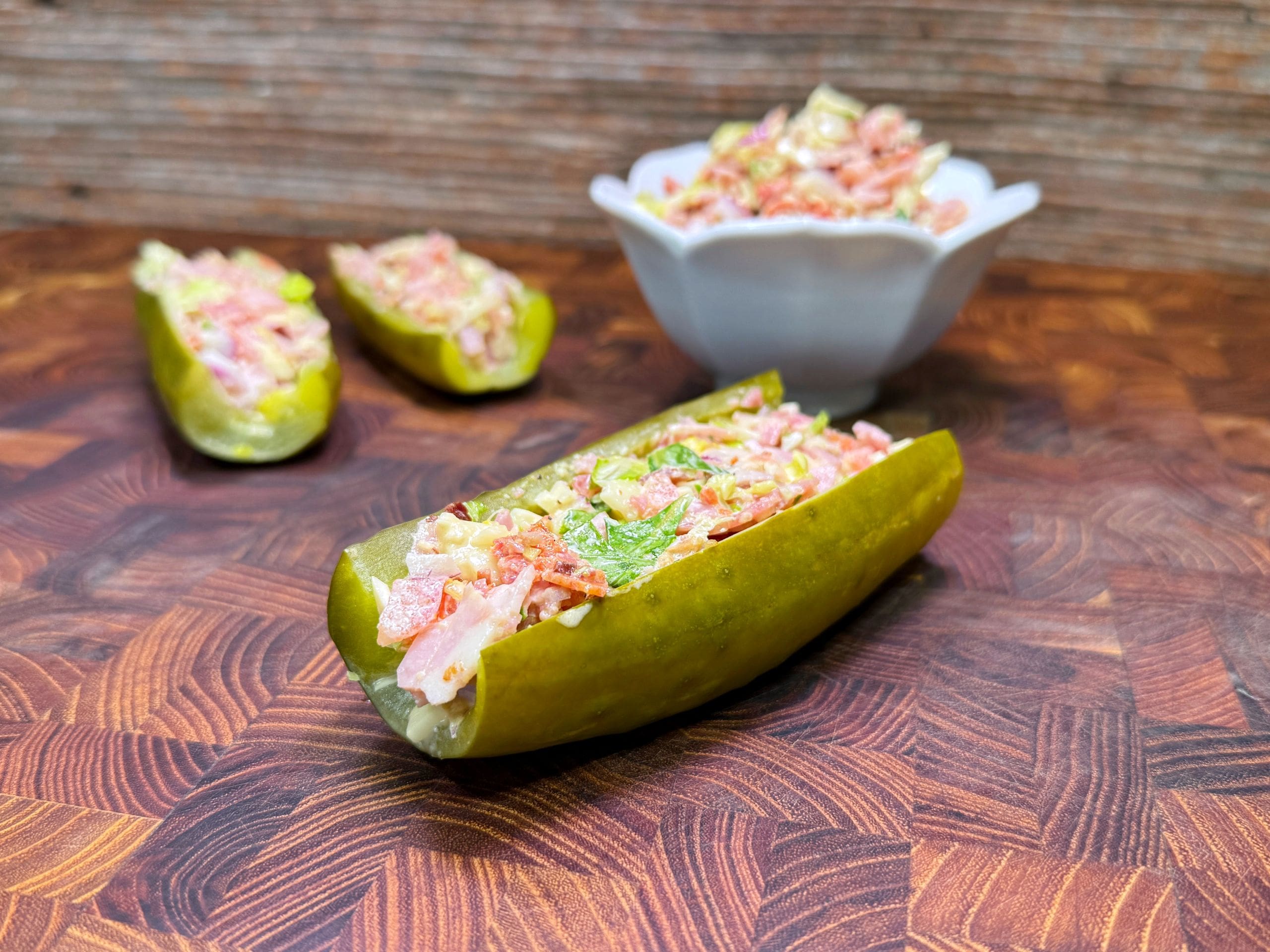 • Scoop up the deli meat mixture and carefully spoon into the prepared pickles. Serve immediately.