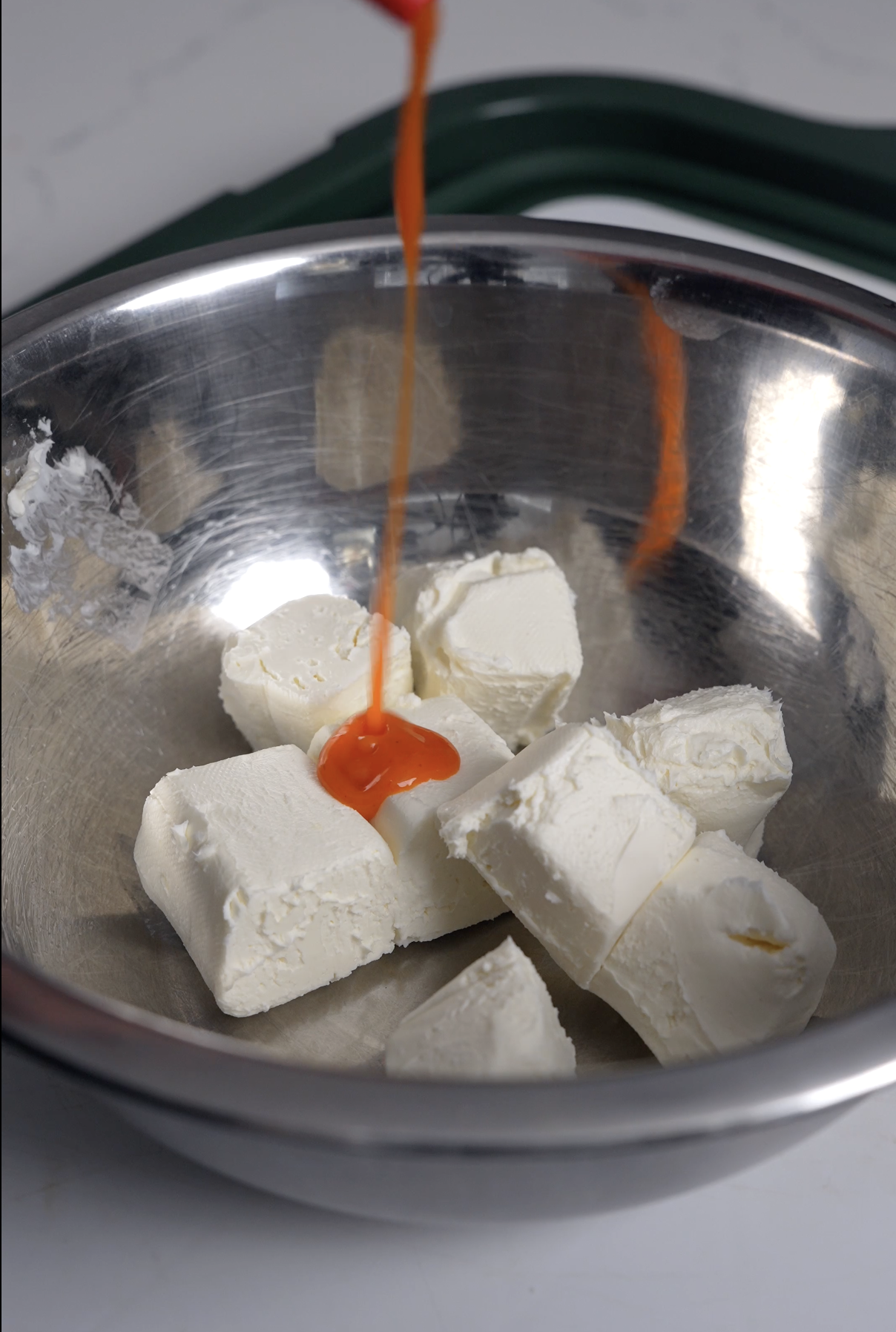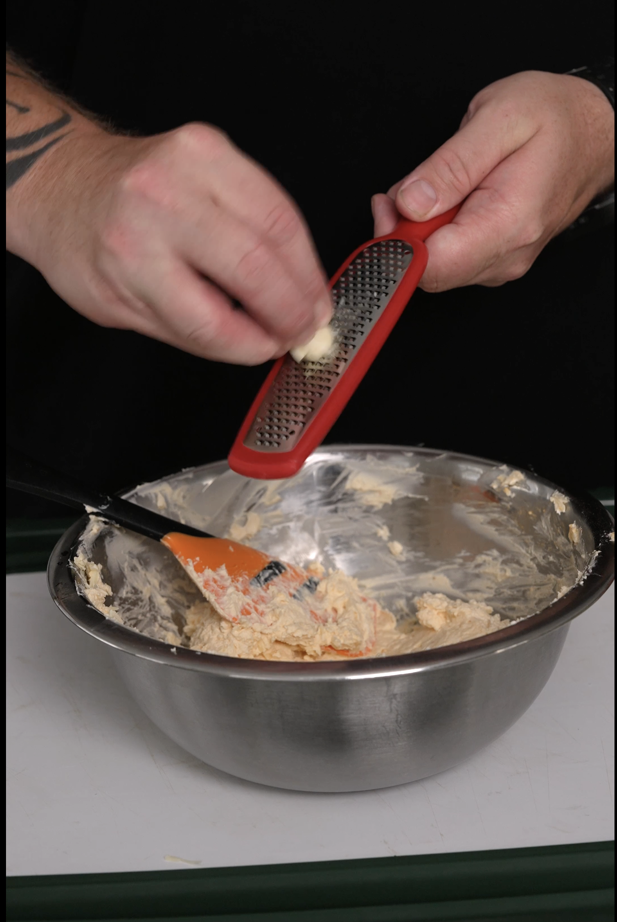 - In a mixing bowl, combine softened cream cheese, ghost pepper wing sauce, shredded white cheddar, grated garlic, and roasted red peppers. Stir until smooth and evenly mixed.