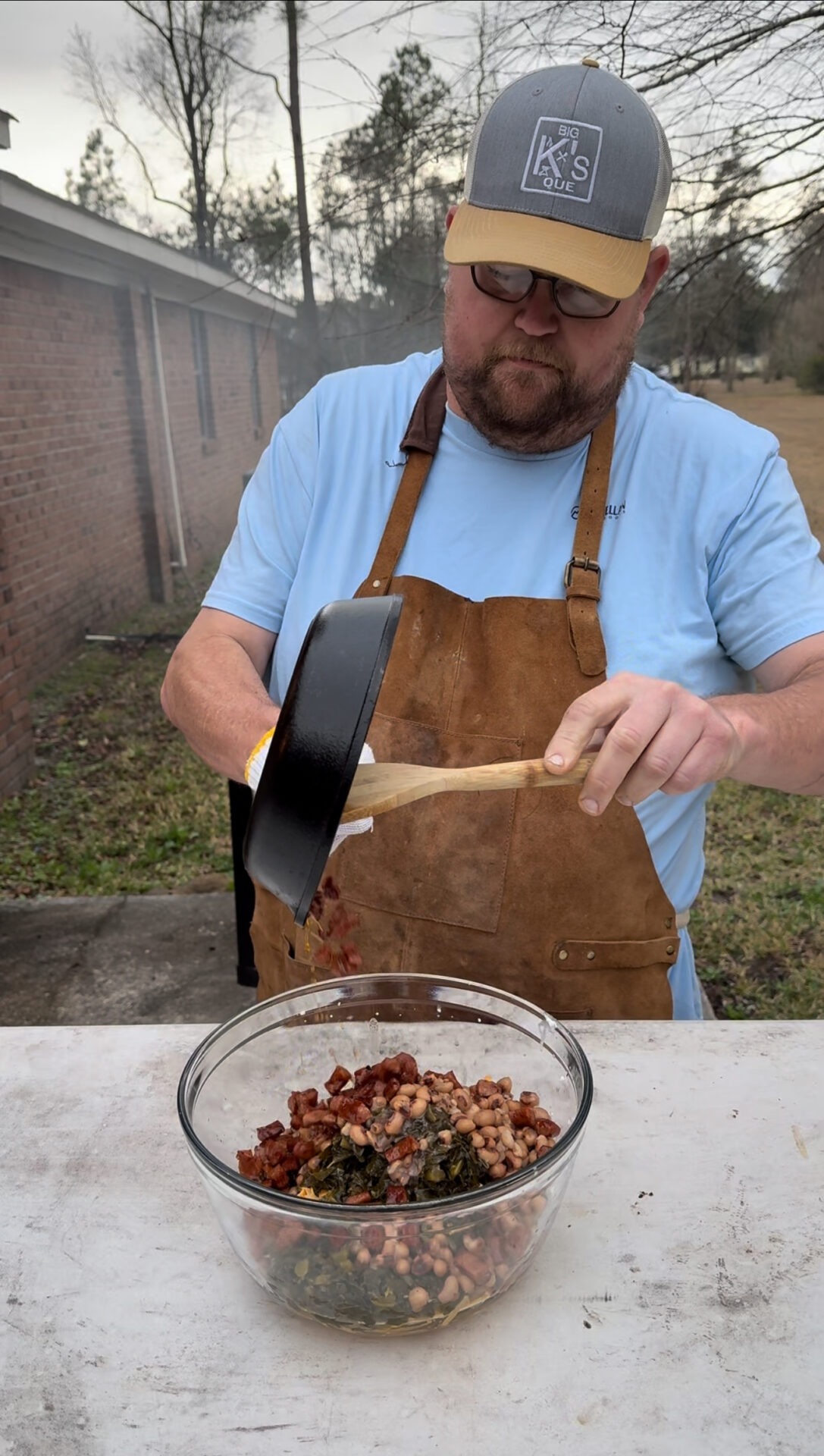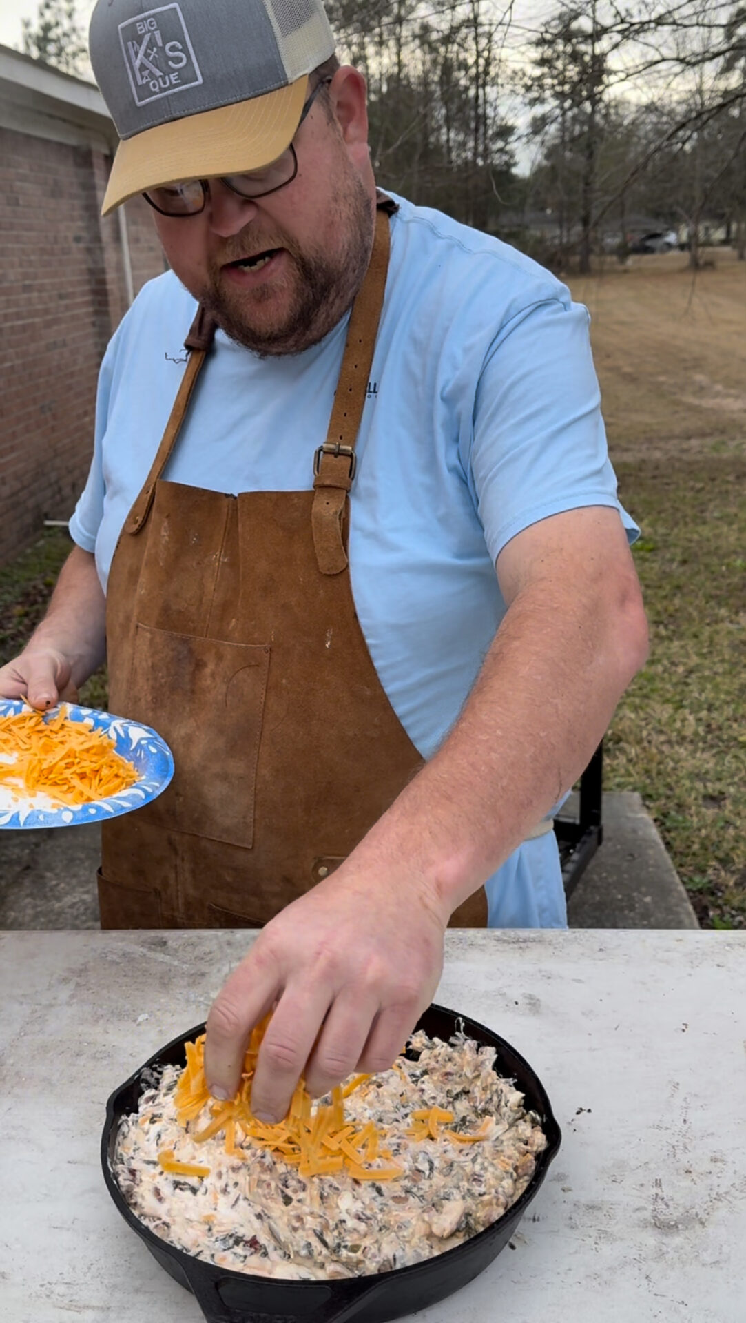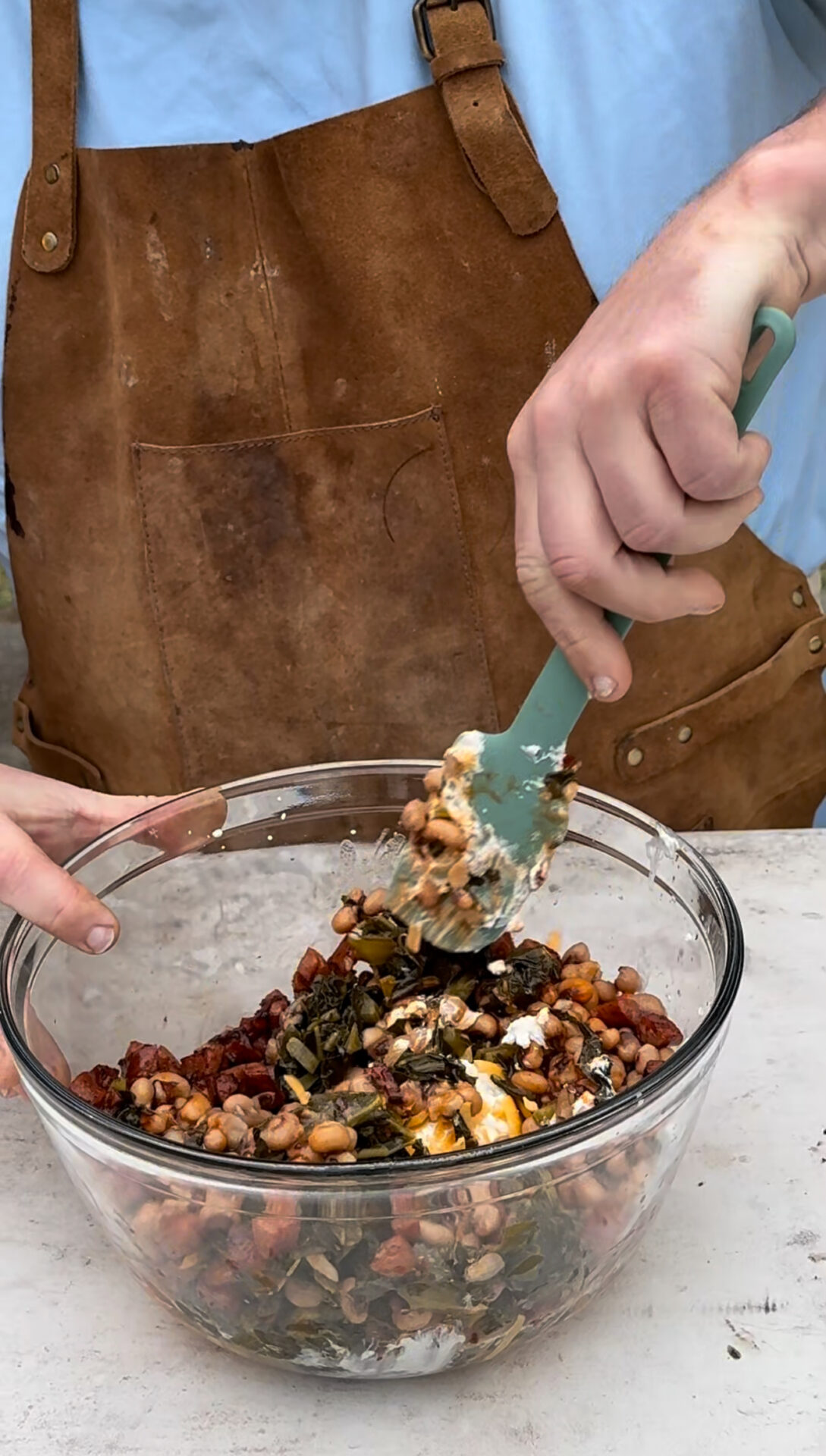 - Mix cream cheese , sour cream , 1 cup cheddar , greens , black eyed peas , sausage , and hot sauce together in a bowl . Then place in greased vessel of your choice . I used a 10” cast iron skillet. Top with remaining cup of cheese and cornbread crumbles. Smoke or bake for 90 minutes at 300 or until golden brown and bubbly . Serve with crackers and enjoy .